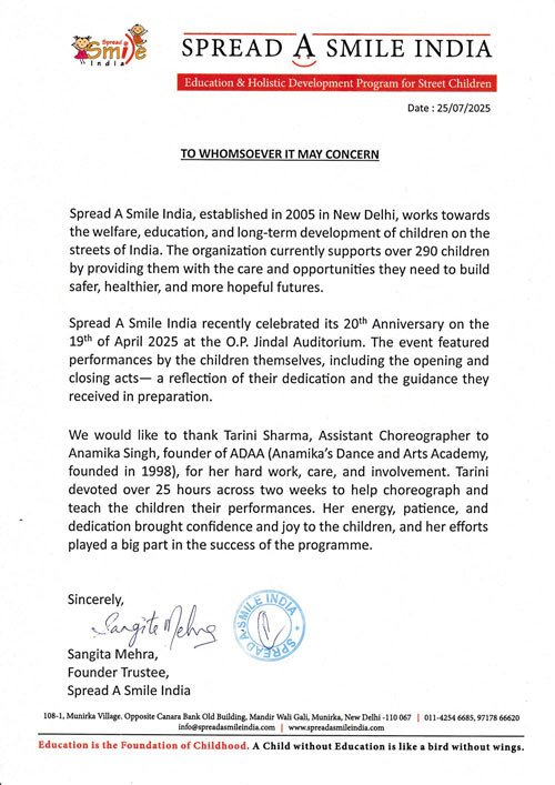 Spread a Smile India is a non-government organization working with over 290 children from the streets in India. Teaching them dance and mindful practices was an incredibly fulfilling experience. The children were talented, eager to learn and carried an inspiring sense of joy and enthusiasm for life.